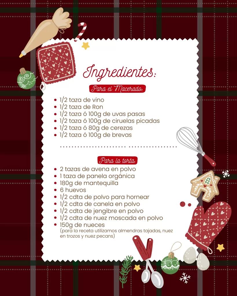 En un bowl grande, combina la avena en polvo, el polvo para hornear, la canela, el jengibre y la nuez moscada. Estos ingredientes le darán a la torta su aroma y sabor característico de Navidad.